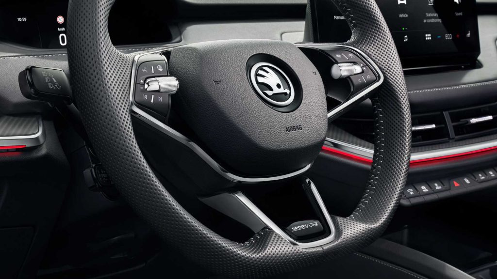 Bir çox hissəsində “Sportline” yazıları olan bu avtomobil, təəssüf ki, standart “Enyaq iV”dən daha güclü bir seçim istəyənləri sevindirmir. Bununla birlikdə, “Şkoda”nın bu ilin sonuna “Enyaq iV vRS” adlanacaq 306 at gücündə bir seçim gətirəcəyi də deyilir.